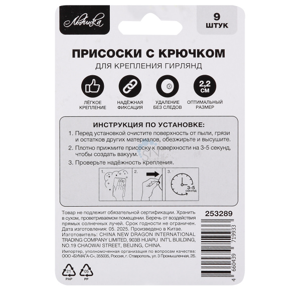 Присоски для крепления гирлянд с крючком 2,2см 9 шт ЛЬДИНКА 253289